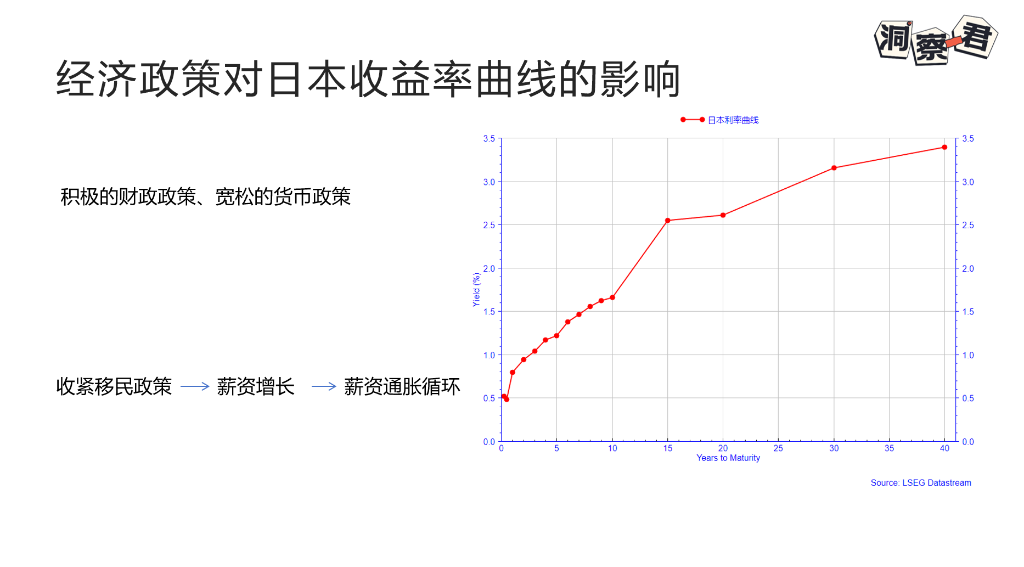 那他对经济会有什么影响呢?较大范围的降税、对中低收入人群进行补贴,同时进行产业政策刺激,短期内会扩大财政赤字,同时限制央行加息的行为,让短端利率预期向下修正。移民政策的收紧,会进一步让本就紧张的日本劳动力市场供给,更加紧缺。中长期的劳动力短缺将不可避免的推高日本的薪资增长,强化薪资通长循环,推动中长期收益率上行。是不是感觉和美国当下的情况也有点类似?