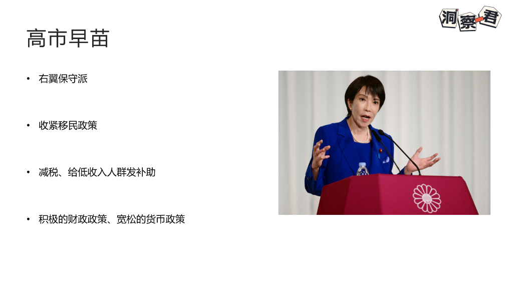 高市早苗是安倍晋三的得意门生,标准的右翼保守派,她提出收紧外劳政策;税收上取消汽柴油暂时税率、扩大地方补助金,并召开临时国会通过补充预算。对中低收入者减税并提供现金补助,以支撑中产阶级;提出日本半导体战略,搞产业保护。大家有没有发现,她的政治主张和特朗普的政治主张抓手非常一致。