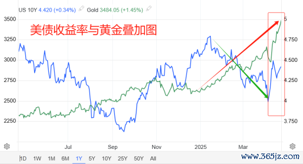 在央行的储备资产当中,黄金和美债具有相互替代的作用。在行情面,美债收益率升高,黄金的比较优势降低,市价存在下跌可能。相反,美债收益率下降时,美国和全球经济的衰退可能性增加,黄金将进入牛市周期。今年1月13日,美债收益率触顶回落,直至4月4日才寻得底部。期间,黄金一路大涨,市价从2600美元左右涨至3100美元左右,市场买入情绪浓厚。