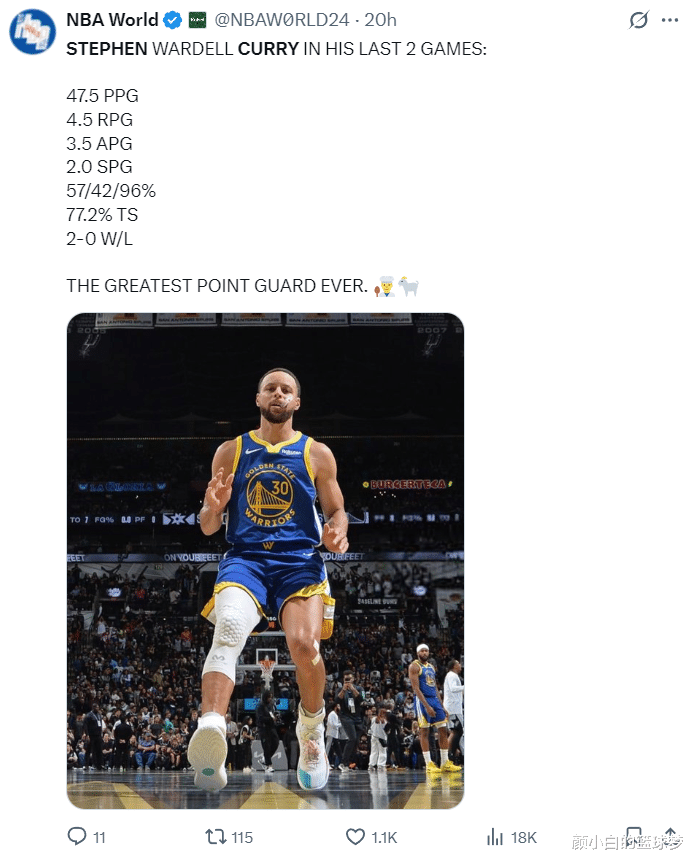 最近这两场比赛对阵马刺,库里场均47.5分4.5篮板3.5助攻2抢断,命中率57%,三分命中率42%,罚球命中率96%,真实命中率77.2%,美媒NBA World:库里是历史上最伟大的控球后卫,GOAT。