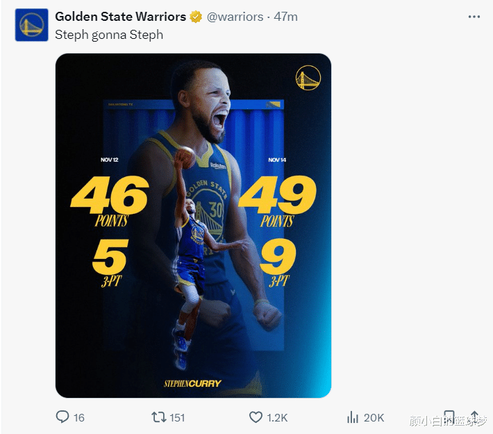 勇士媒体专门制作了这张GOAT的宣传海报,再度盛赞库里。