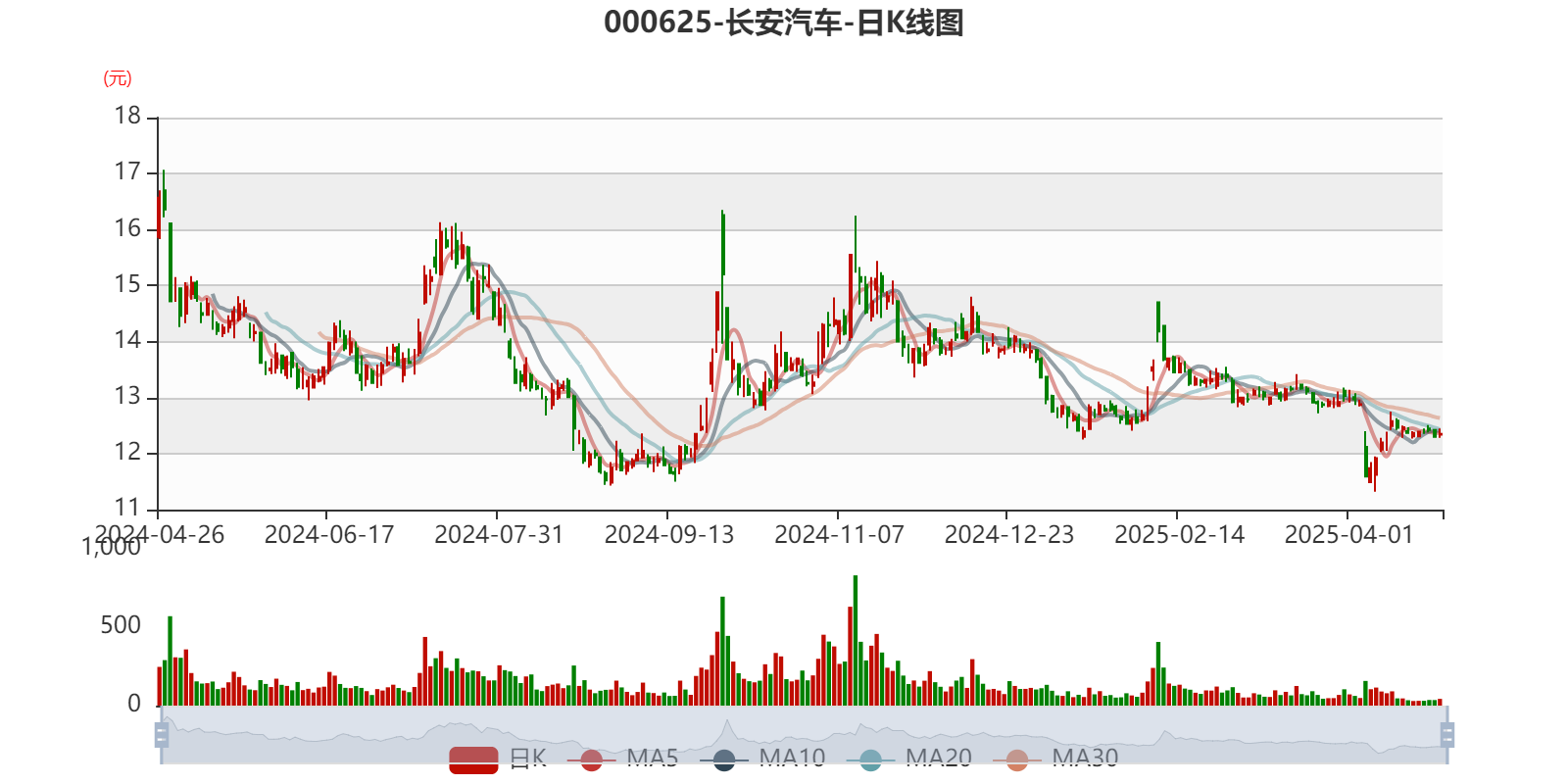 以4月25日收盘价计算,长安汽车目前市盈率(TTM)约为16.29倍,市净率(LF)约1.57倍,市销率(TTM)约0.78倍。