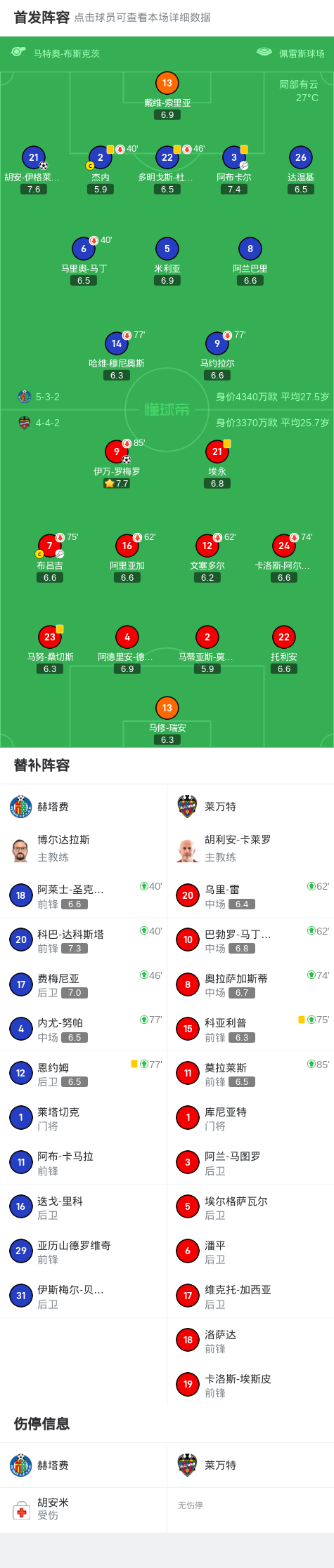 北京时间9月27日,西班牙足球甲级联赛第7轮展开角逐,赫塔费坐镇主场迎战莱万特。比赛过程中旗开网,莱万特率先打破僵局,布吕吉送出助攻,伊万-罗梅罗完成破门。此后赫塔费展开反击,阿布卡尔精准传球助胡安-伊格莱西亚斯扳平比分。双方均未能再度改写比分,最终以1比1握手言和。